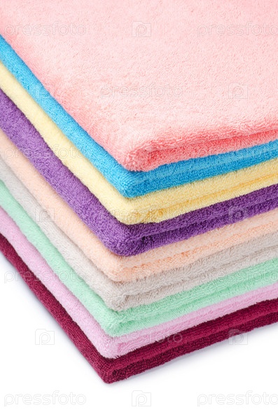 Стопка разноцветных полотенец на белом фоне