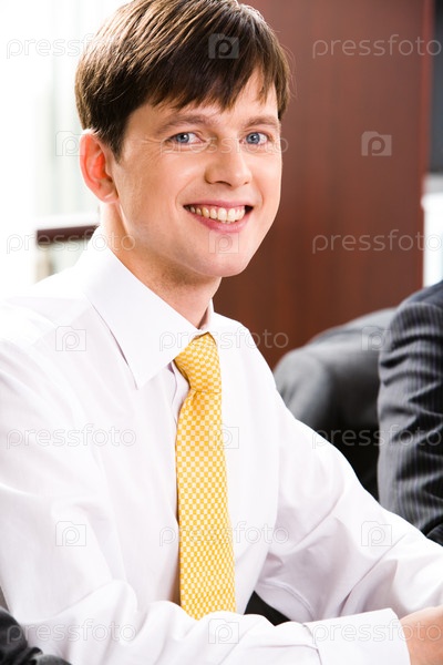 Портрет уверенного улыбающегося бизнесмена, смотрящего на камеру