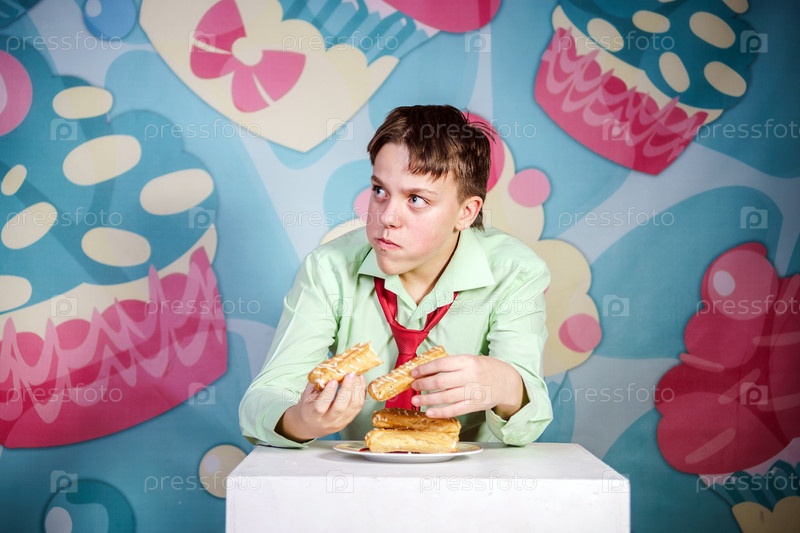 Забавный мальчик ест сладкие пирожные