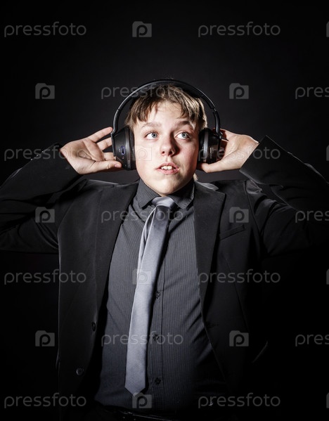 Подросток в костюме слушает музыку