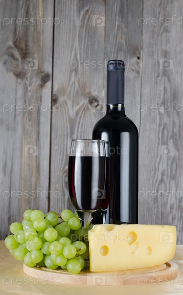 Виноград, сыр, бутылка вина и бокал на фоне деревянных досок