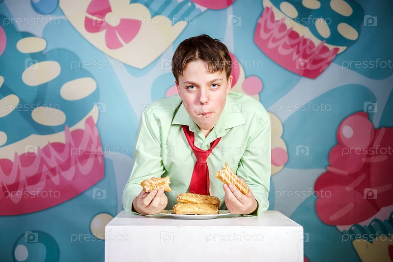 Забавный мальчик ест сладкие пирожные