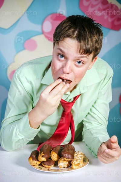 Забавный мальчик ест сладкие пирожные