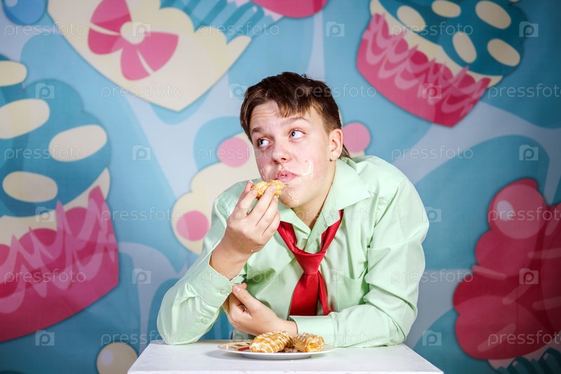 Забавный мальчик ест сладкие пирожные
