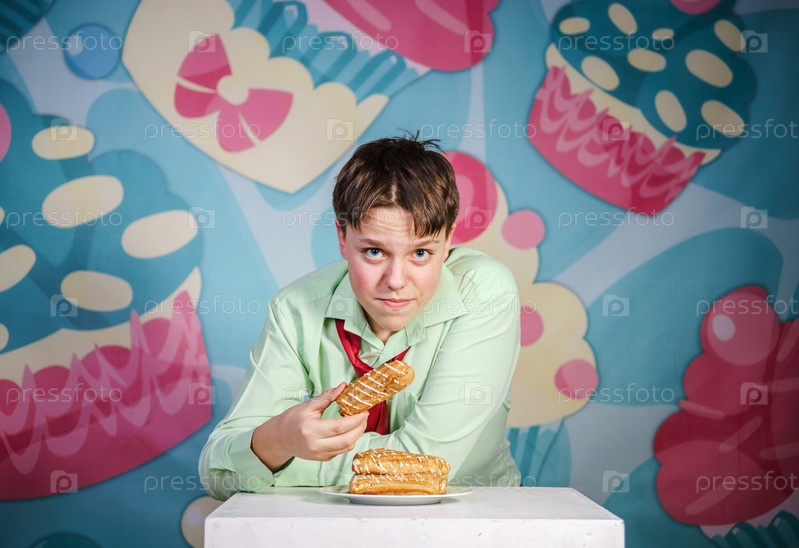 Забавный мальчик ест сладкие пирожные