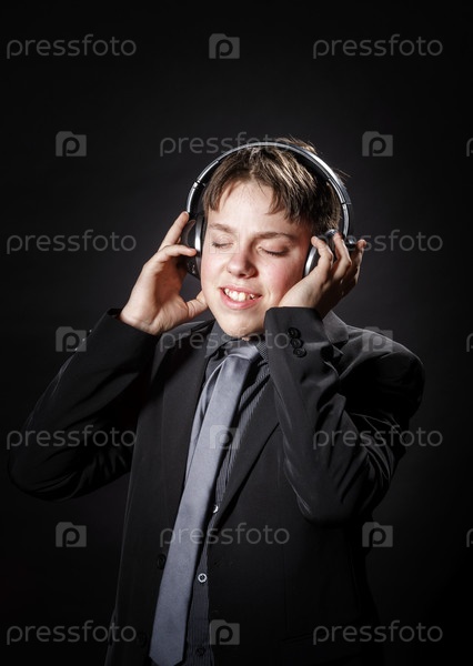 Подросток в костюме слушает музыку в наушниках