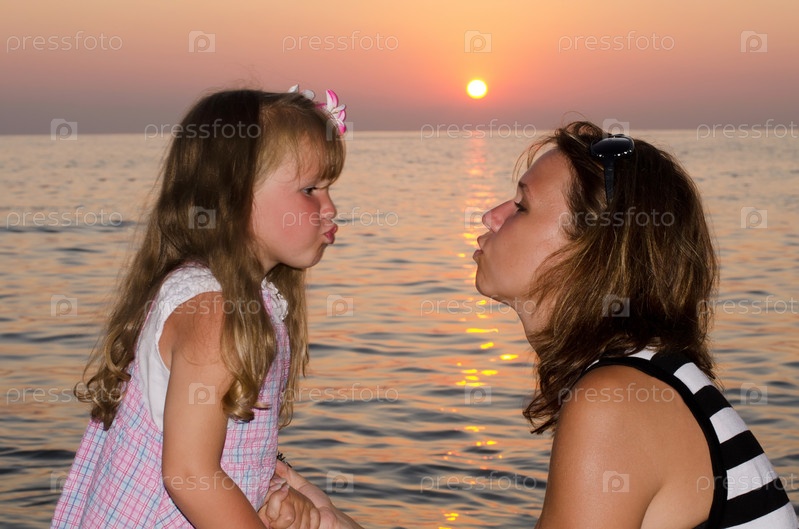 Мама и дочка на фоне морского заката