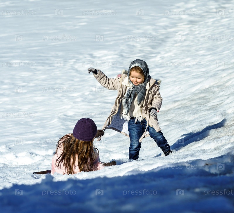 Симпатичные маленькие сестры играют в снегу