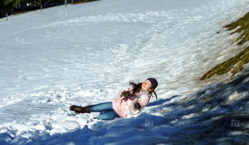 Милая девушка играет в белом снегу