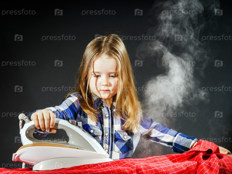 Милая маленькая девочка гладит одежду