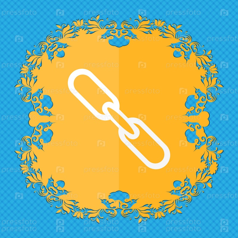 Знак значок ссылки. Символ гиперссылке цепи. Цветочный дизайн квартиры на синий абстрактный фон с местом для текста