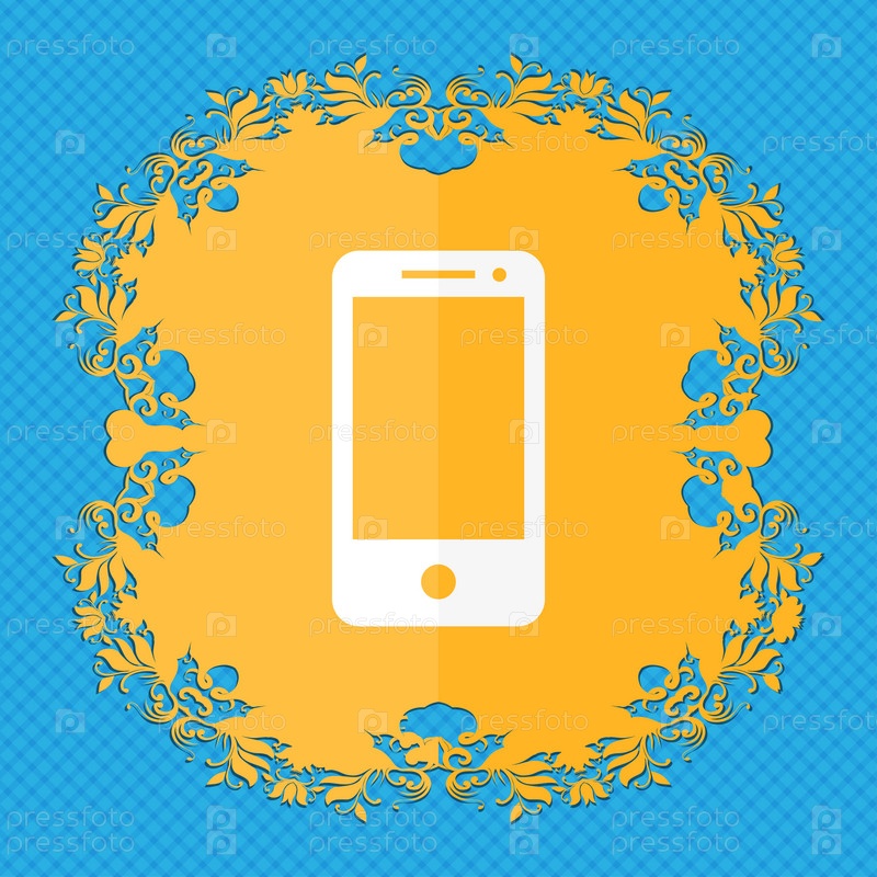 Смартфон знак значок. Символ поддержки. Цветочный дизайн квартиры на синий абстрактный фон с местом для текста