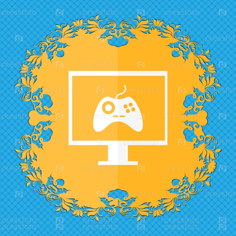 Джойстик и монитор знак значок. Видео игры символ. Цветочный дизайн квартиры на синий абстрактный фон с местом для текста
