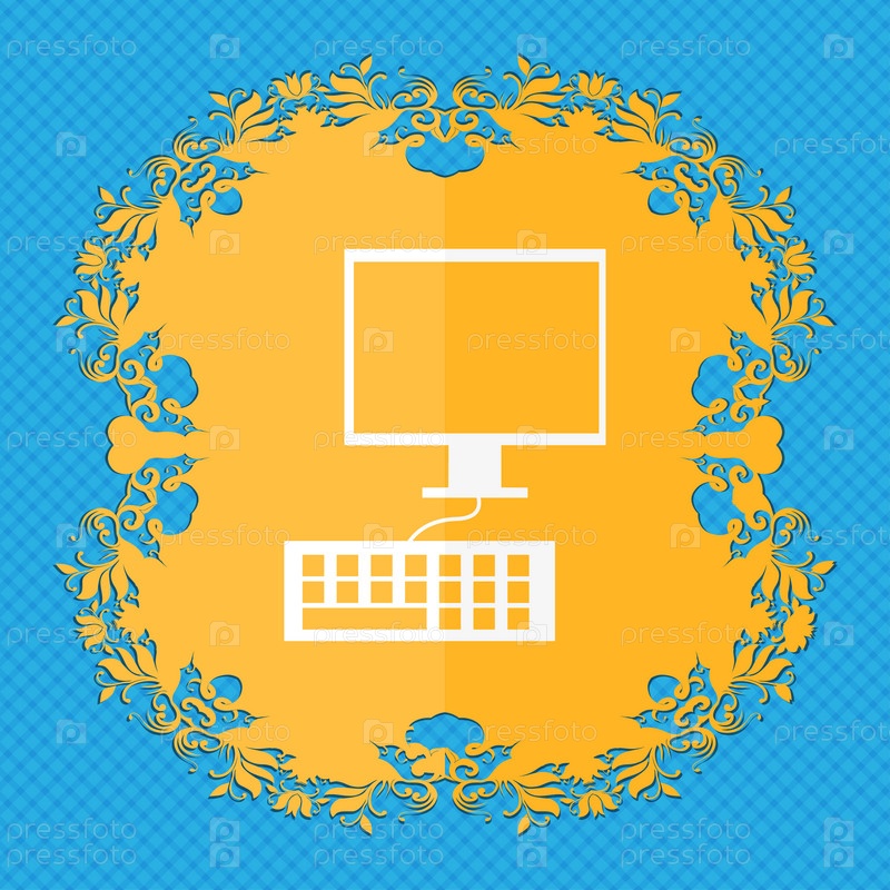 Монитор компьютера и клавиатуры значок. Цветочный дизайн квартиры на синий абстрактный фон с местом для текста