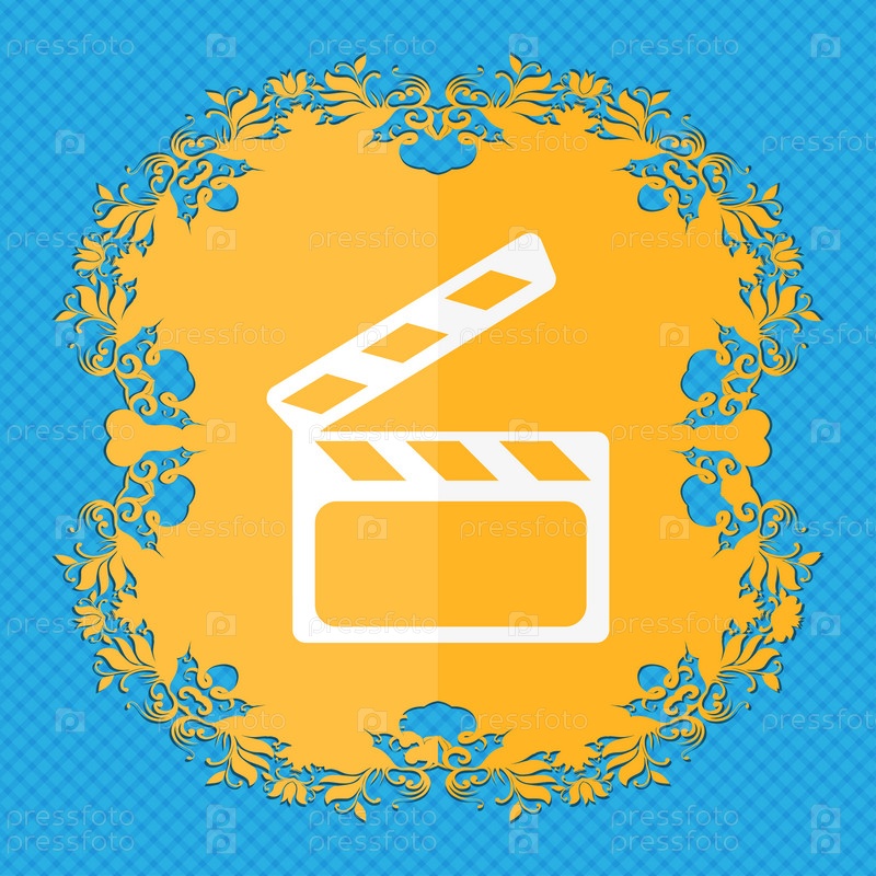 Кино Клаппер знак значок. Видео камеры символ. Цветочный дизайн квартиры на синий абстрактный фон с местом для текста