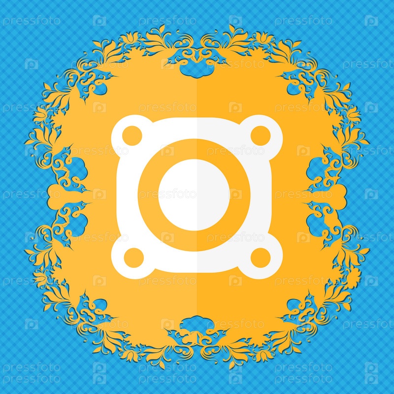Значок знак громкости динамика. Символ звука. Цветочный дизайн квартиры на синий абстрактный фон с местом для текста