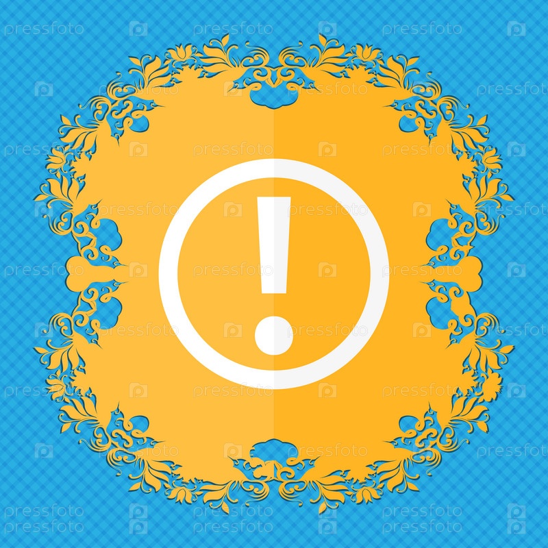 Изображение знака внимания. Восклицательный знак. Символ предупреждения об опасности. Цветочный дизайн квартиры на синий абстрактный фон с местом для текста