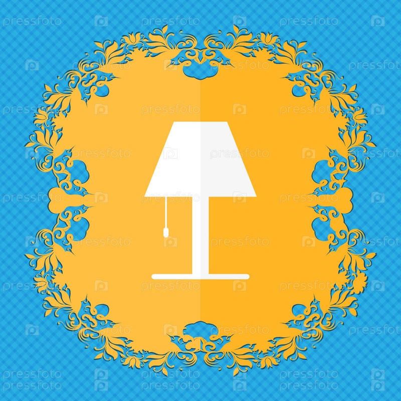 Лампа значок знак. Цветочный дизайн квартиры на синий абстрактный фон с местом для текста