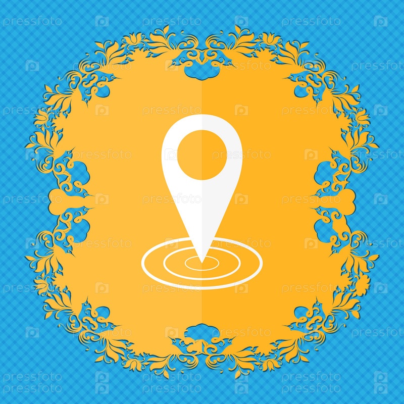Карта знак значок указателя. Цветочный дизайн квартиры на синий абстрактный фон с местом для текста