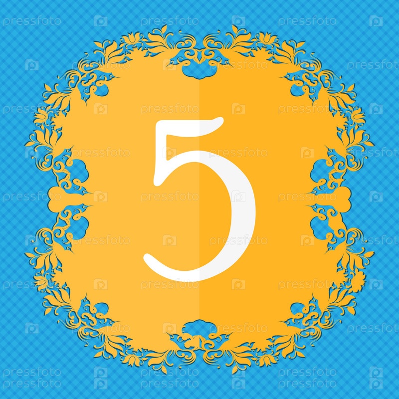 Номер пять значок знак. Цветочный дизайн квартиры на синий абстрактный фон с местом для текста