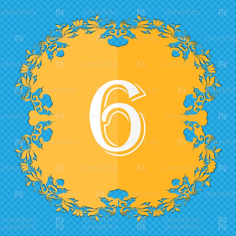 Номер шесть значок знак. Цветочный дизайн квартиры на синий абстрактный фон с местом для текста