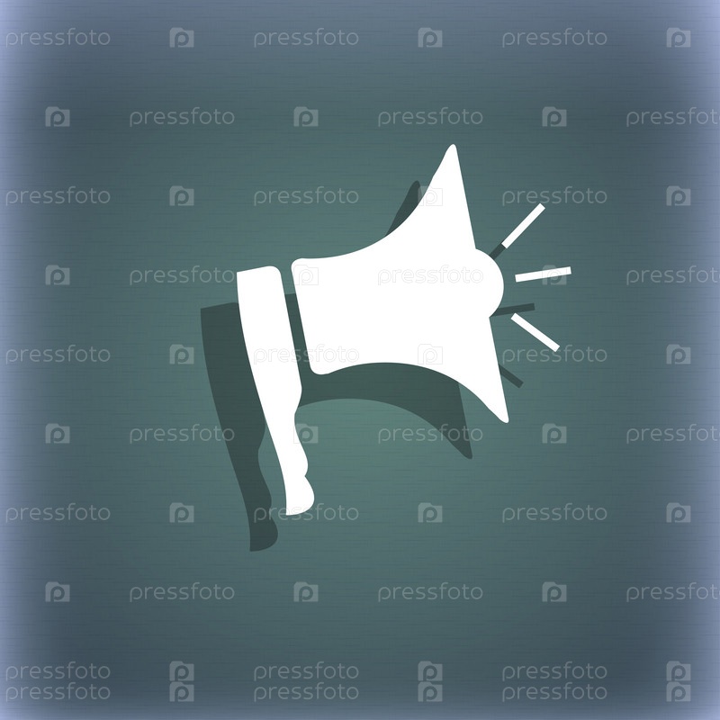 Мегафон вскоре значок. Символ громкоговорителя. На сине зеленый абстрактный фон с тенью и пространства для вашего текста