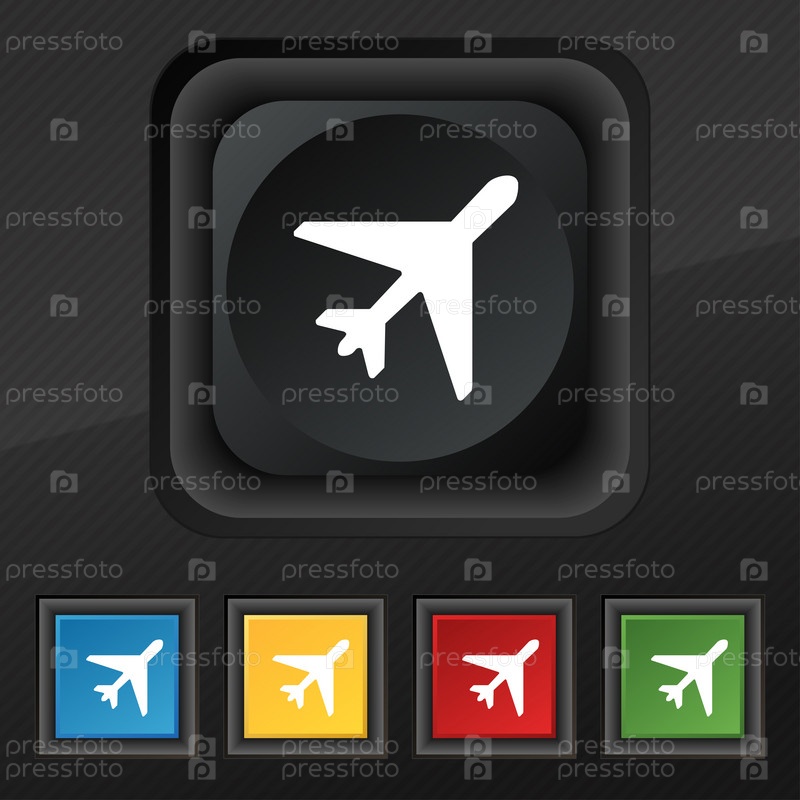 Самолет значок символа. Набор пяти красочные, стильные кнопки на черные текстуры для вашего дизайна