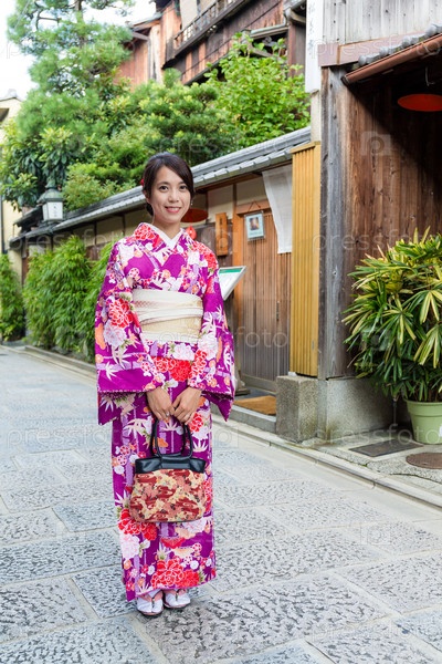 Женщина с заправкой кимоно на улице