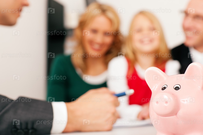 Маленькая девочка с копилкой-свиньей в кругу бизнесменов