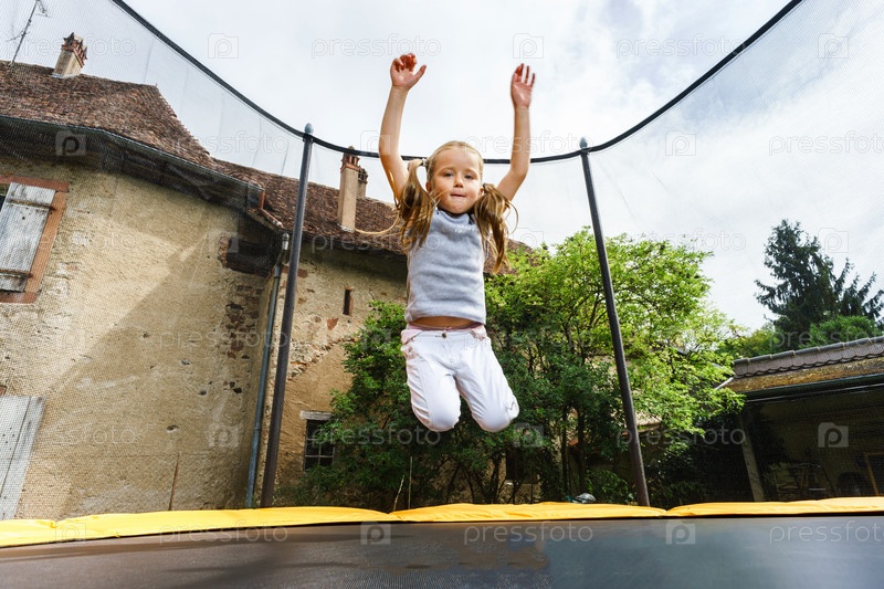 Маленькая девочка прыгает на батуте