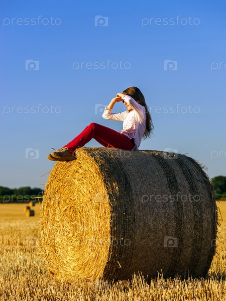 Девушка с длинными волосами на стоге сена