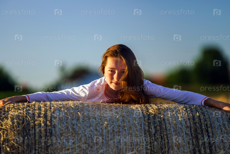 Девушка с длинными волосами на стоге сена