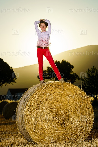 Девушка с длинными волосами на стоге сена