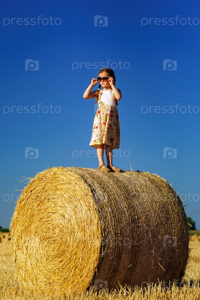 Смешная милая маленькая девочка на стоге сена