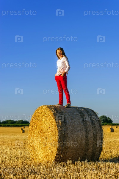 Девушка с длинными волосами на стоге сена