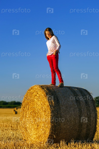 Девушка с длинными волосами на стоге сена