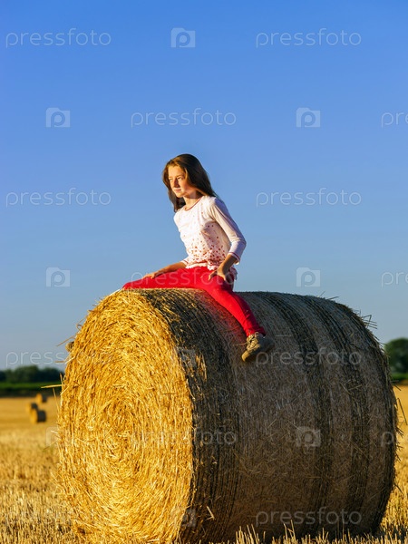 Девушка с длинными волосами на стоге сена