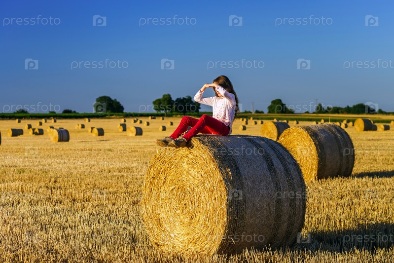 Девушка с длинными волосами на стоге сена