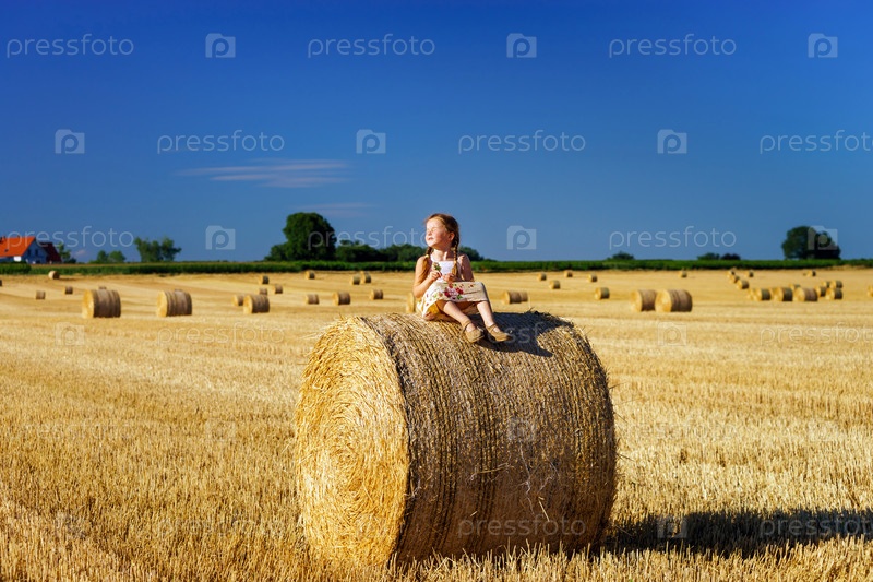 Смешная милая маленькая девочка на стоге сена
