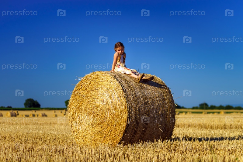 Смешная милая маленькая девочка на стоге сена