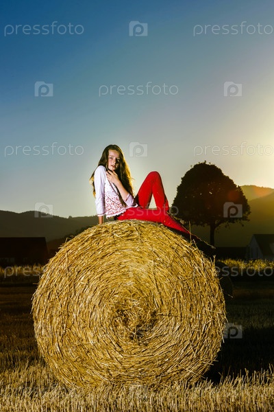 Девушка позирует на вечер на стоге сена