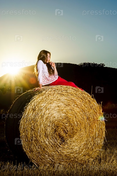 Девушка позирует на вечер на стоге сена