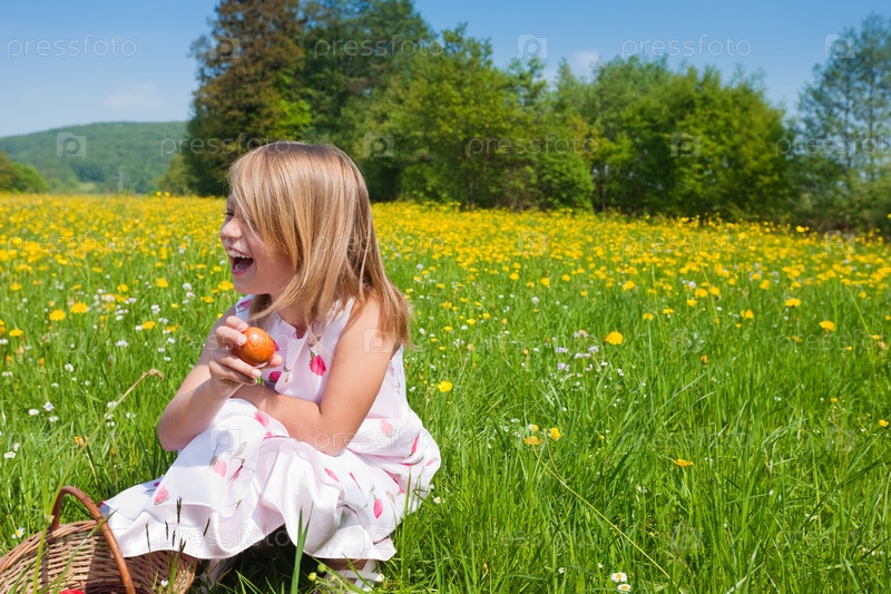 Маленькая девочка сидят в поле с корзинкой с пасхальными яйцами