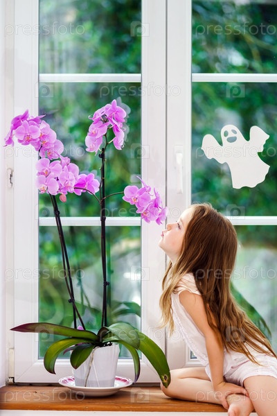Милая маленькая девочка с цветком, сидя на подоконнике