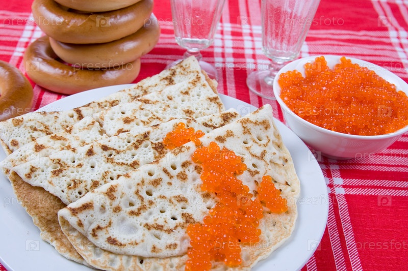 Блинчики с красной икрой на тарелке.Празднование Масленицы - российский религиозный народный праздник