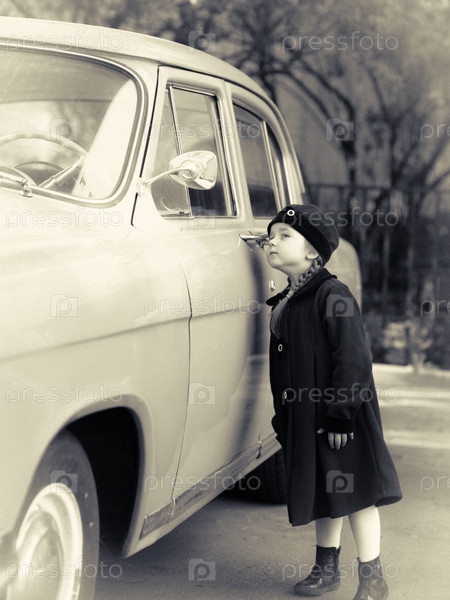 Милая маленькая девочка, одетая в ретро пальто позирует возле автомобилей