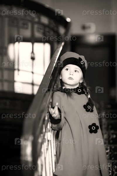 Милая маленькая девочка, одетая в ретро стиль пальто внутри Старый дом