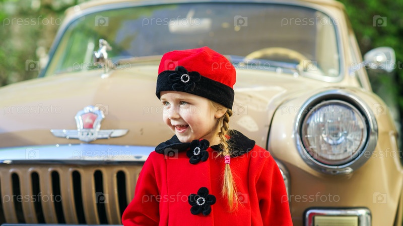 Милая маленькая девочка, одетая в ретро пальто позирует возле автомобилей