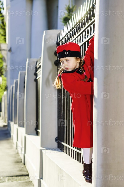 Милая маленькая девочка одетая в старом стиле пальто позирует на улице