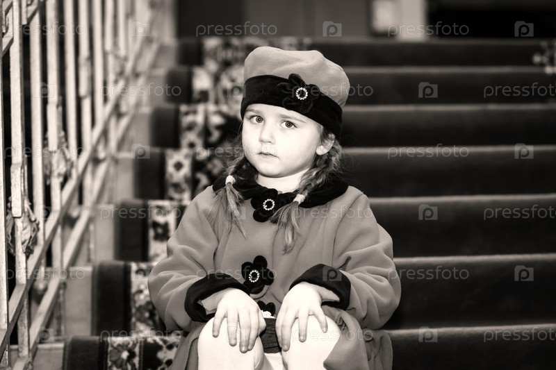 Милая маленькая девочка, одетая в ретро стиль пальто внутри Старый дом